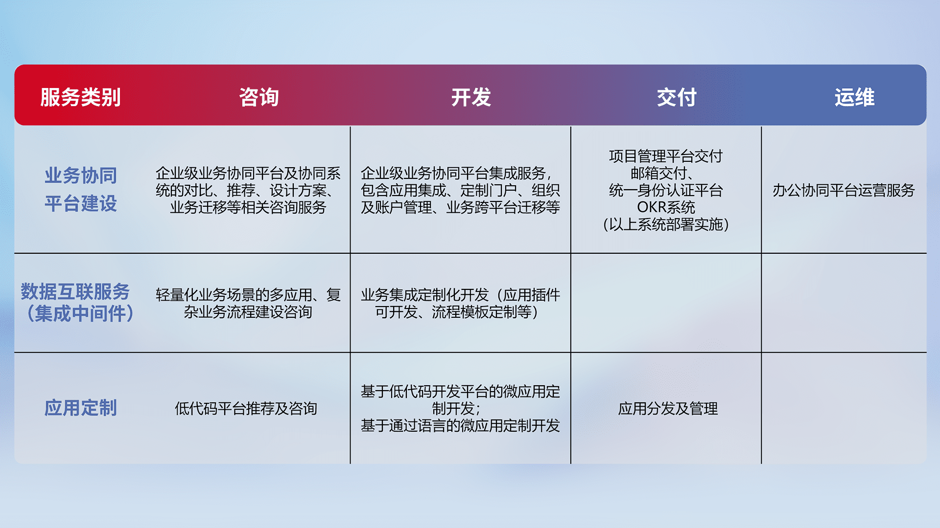 针对钉钉、、企微、、IDaas等平台级产品提供产品的规划、、方案、、交付、、、、定制化开发等服务,,,实现如统一协同办公、、智能客户服务、、混合会议管理、、、、智能数据查询、、、等业务场景,,实现数字化转型。。。。