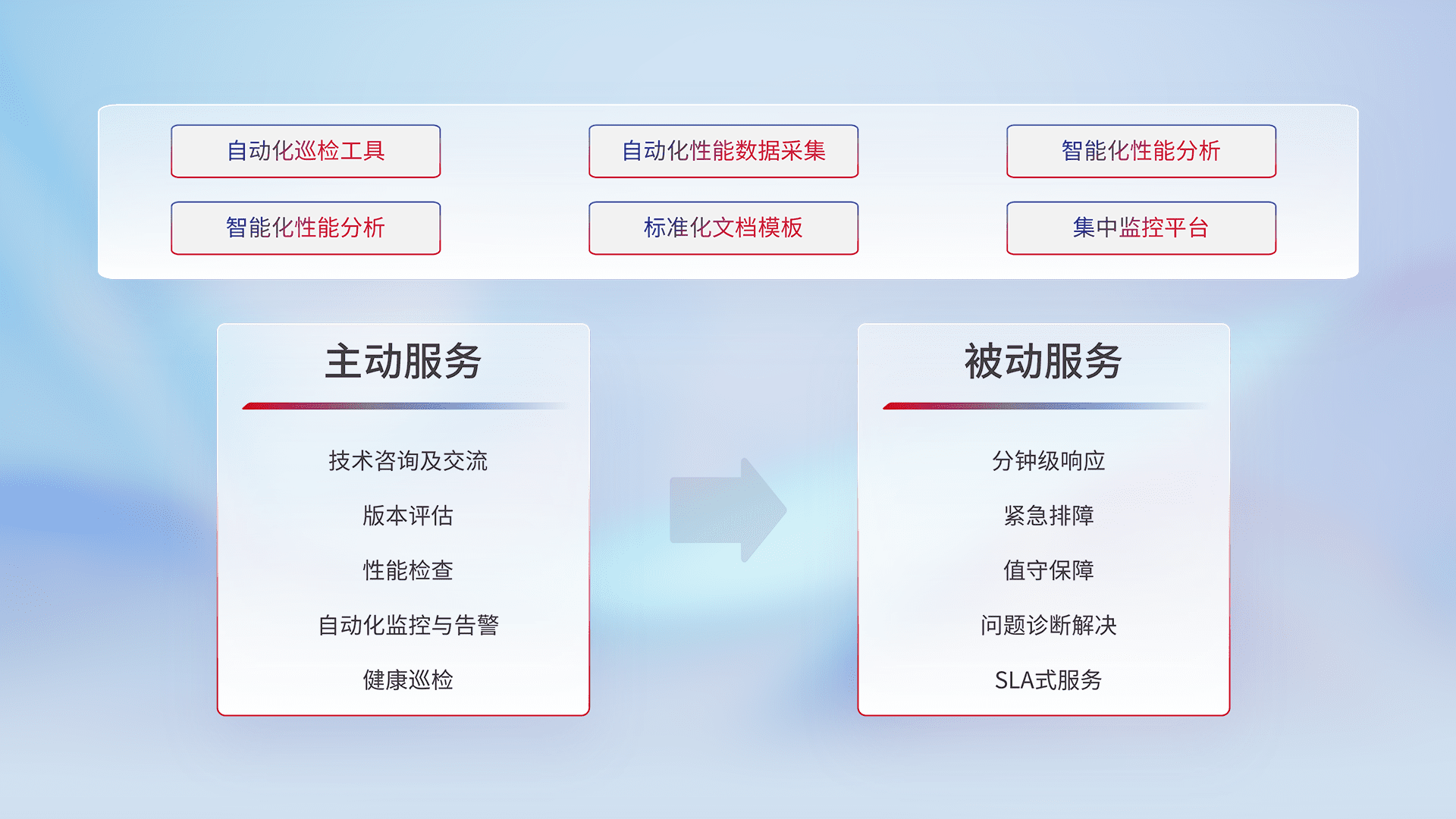 智能化工具和标准化文档,,,保障服务质量,,,,提供主动服务(包含技术咨询、、、、版本评估、、、、性能检查、、、、自动化监控与告警、、、健康巡检)和被动服务包含(分钟级响应、、、、紧急排障、、值守保障、、、问题诊断解决、、、SLA服务)。。。
