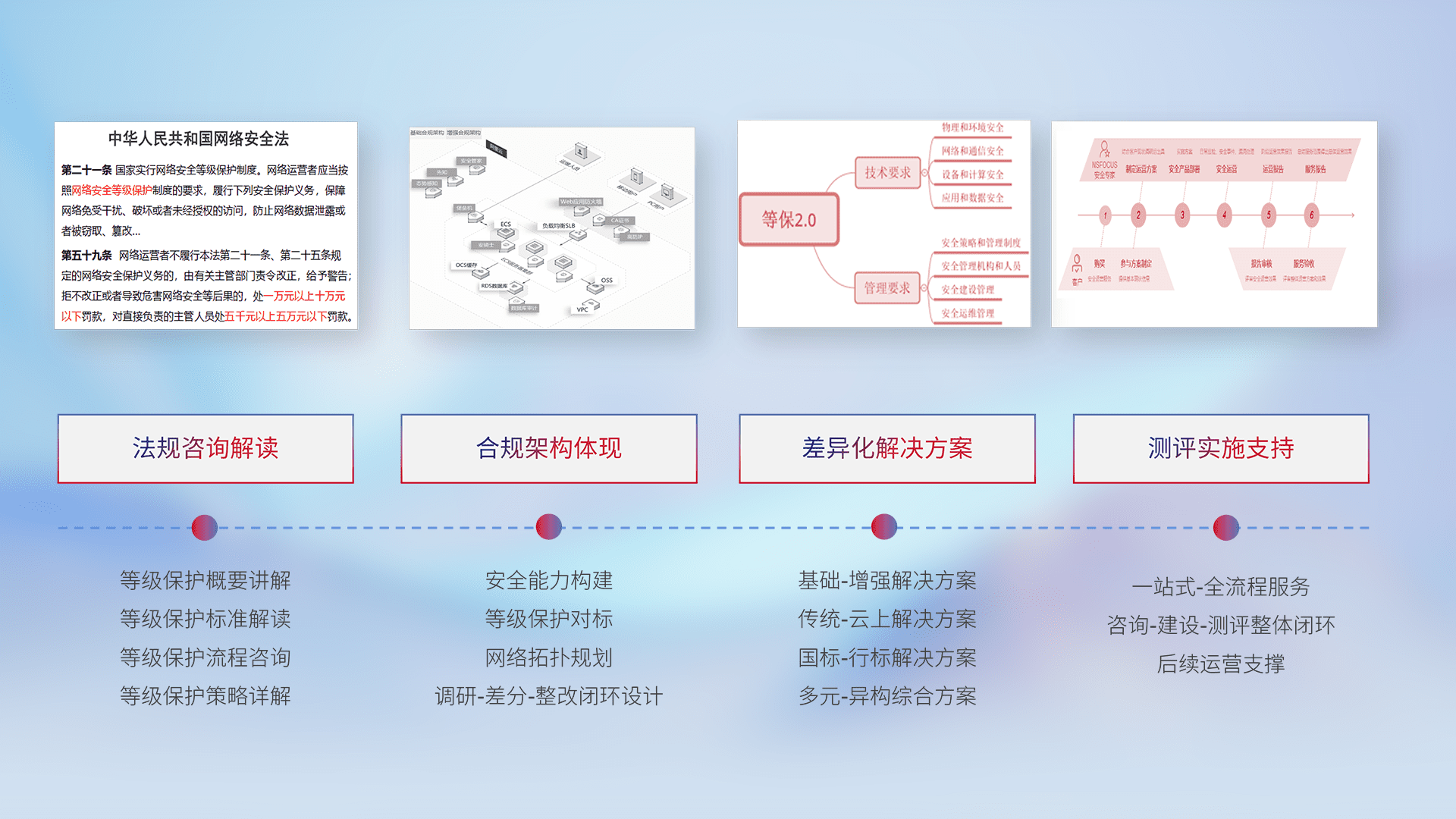 通过专业的法律咨询解读、、合规架构体现、、、、差异化解决方案、、、测试实施支持等服务,,,,为客户量身打造等保合规体系。。。